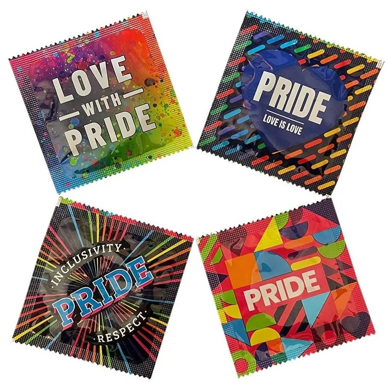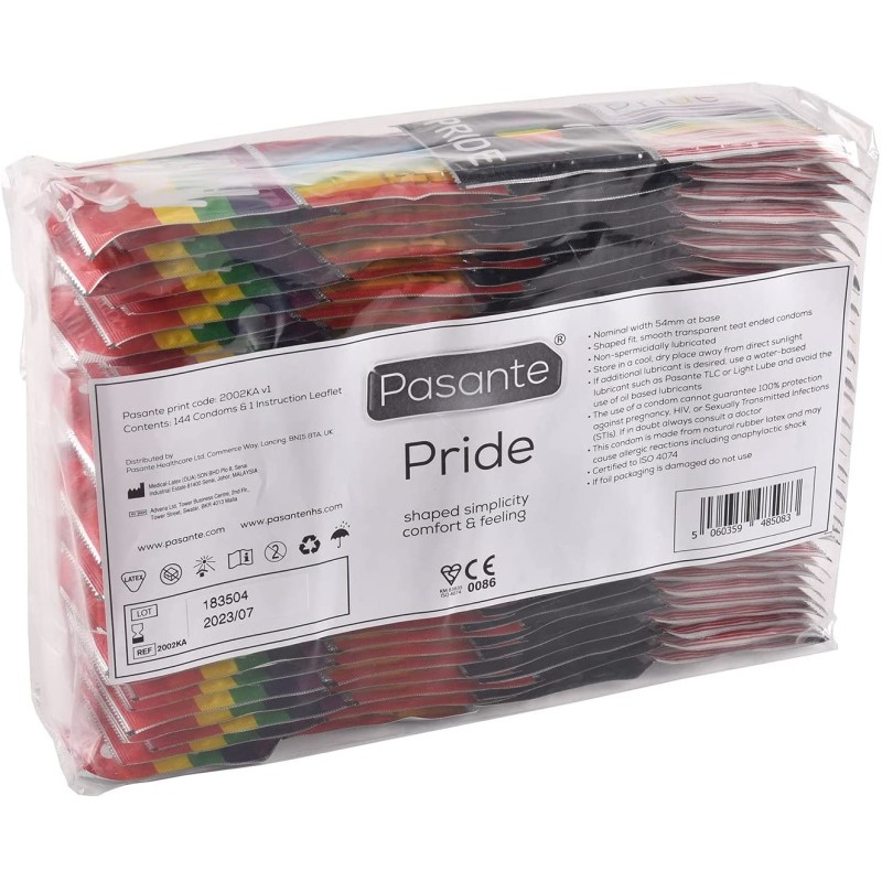 Pasante Pride: 144 condones naturales y transparente lubricados con un chulo diseño de embalaje relacionado con el tema de Orgullo Gay.