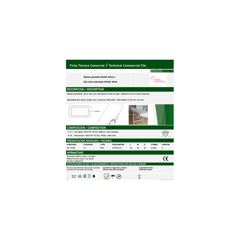 Sábana ajustable de 95X245, en caja de 200 unidades para un solo uso, fabricada en tela sin tejer. Elásticos en las cuatro esquinas. Libres de látex y de fácil postura.