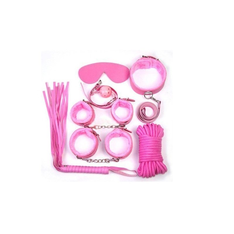 Muñequeras y tobilleras, cuerda, correas ajustables, venda, látigo y mordaza con bola de mordida.