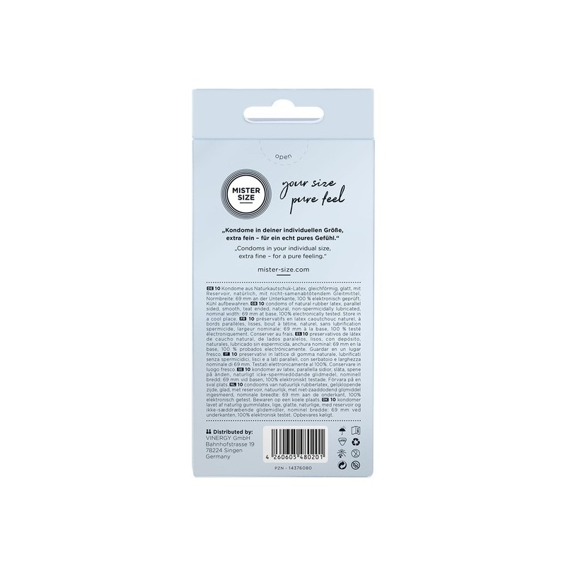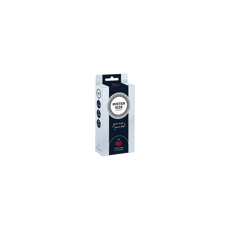 - CALIDAD PREMIUM: Todos los condones Mister Size 60 están dermatológicamente probados y 100% inspeccionados electrónicamente y certificados según CE 0123 / Iso 4074. Hecho en Alemania.
