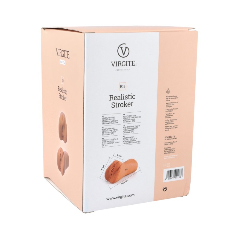 Descubre una experiencia íntima sin precedentes con el Masturbador VIRGITE R19, diseñado meticulosamente para simular sensaciones auténticas y proporcionarte el máximo placer. Este juguete erótico de la prestigiosa marca española VIRGITE - REALISTICS, conocida por su compromiso con la calidad y la innovación, ofrece una experiencia doblemente gratificante gracias a sus dos orificios, vaginal y anal, fabricados en material TPR de alta calidad que simula la piel humana al tacto. Con estrías internas cuidadosamente diseñadas para intensificar cada movimiento, el Masturbador R19 promete llevarte a cimas de placer previamente inexploradas.