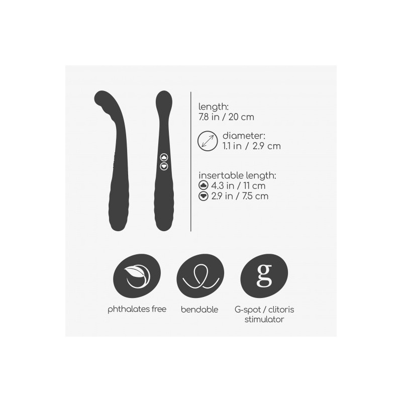 Para activar el extremo del Punto G, pulsa el botón superior del vibrador durante 3 segundos. Cambia entre los 10 modos de vibración con pulsaciones adicionales. Para apagarlo, mantén el mismo botón presionado durante 2 segundos. Para el borde recto, sigue el mismo procedimiento con el botón inferior. Asegúrate de cargar completamente el Pixie antes de su primer uso (2 horas de carga inicial, 90 minutos de carga completa en usos posteriores) y disfruta de hasta 60 minutos de placer.