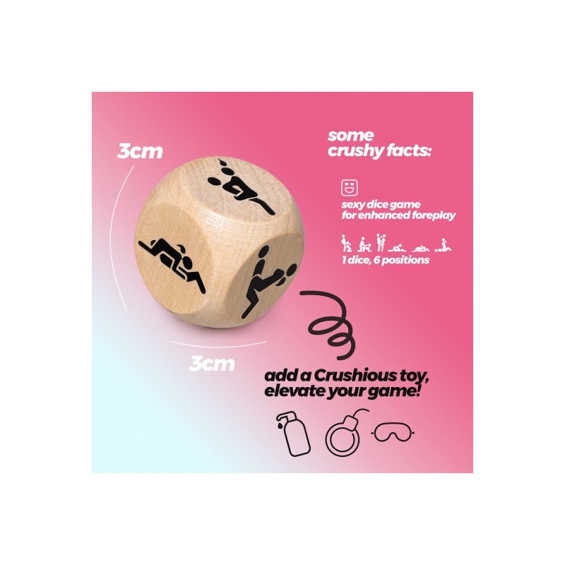 El dado de madera con posturas de Crushious es una forma divertida y emocionante de explorar nuevas posiciones sexuales y añadir variedad a tus encuentros íntimos. Con su diseño simple y eficaz, es el complemento perfecto para cualquier noche de pasión.