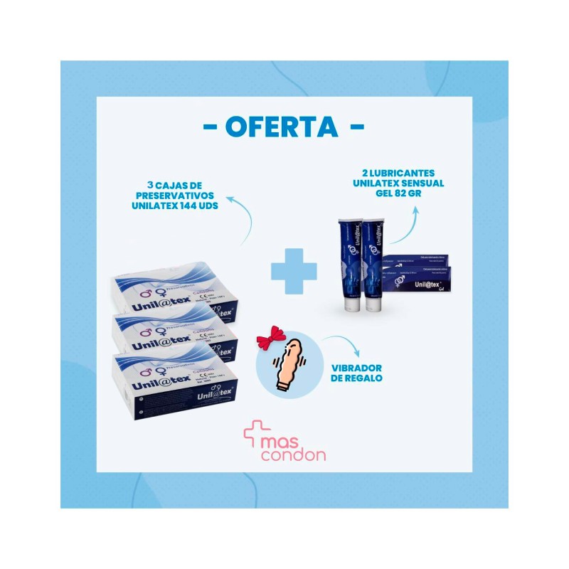 Descubre el Pack Ultra Placer Unilatex, diseñado para quienes buscan una experiencia completa, segura y excitante. Este combo incluye 432 preservativos naturales, 2 lubricantes Unilatex Sensual Gel de 82 g y un vibrador aleatorio de regalo para que tus encuentros sean inolvidables.