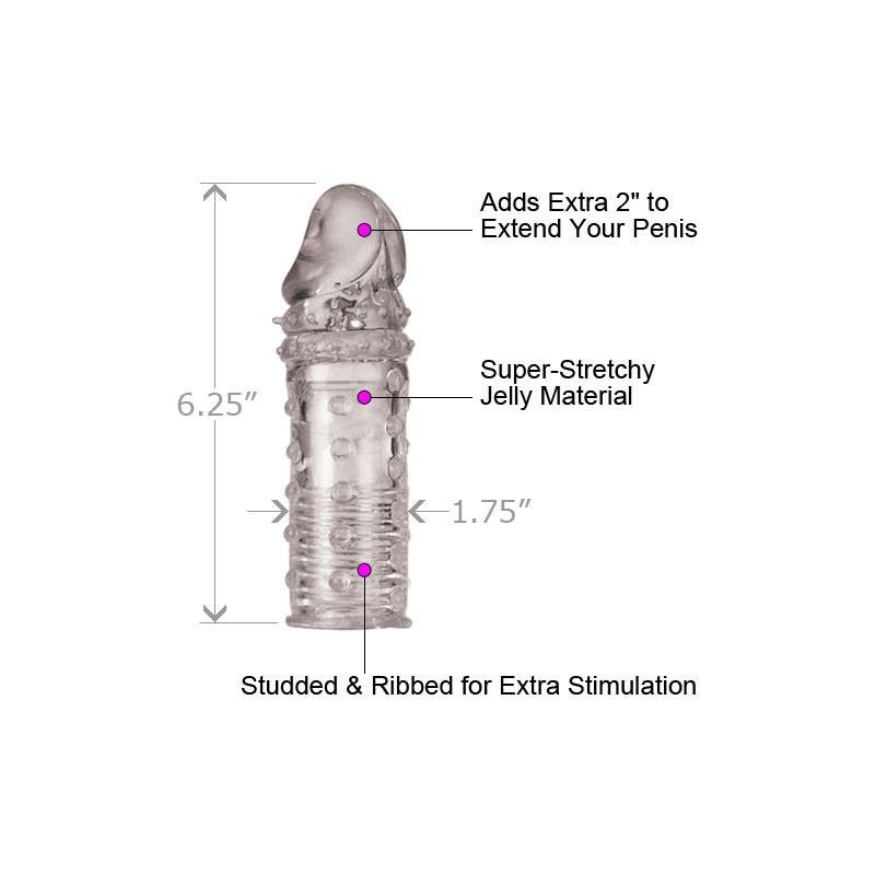 Funda de suave silicona de la más alta calidad, no tóxica y libre de phalatos, pudiendo con ella, además de aumentar la longitud y grosor de tu pene en 5 cm., darle mucho más placer a tu pareja. Con su recorrido texturado aumenta el roce de la zona vaginal.