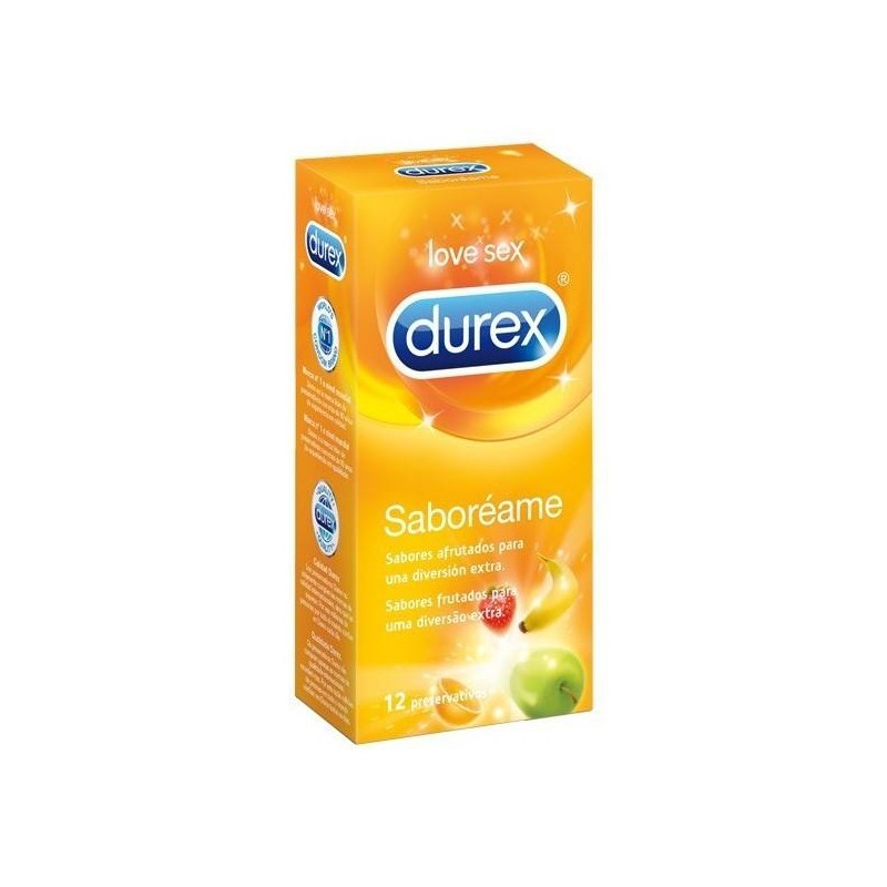 Esta es una caja con 12 condones marca DUREX saboréame, con aromas y sabores afrutados (fresa, naranja, plátano y manzana), para una súper diversión.