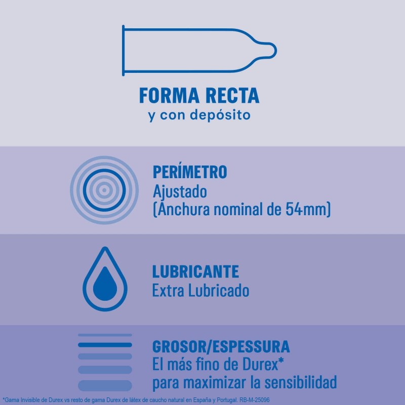 Los Durex Invisibles Extra Lubricados son los preservativos más finos de Durex, diseñados para ofrecerte una máxima sensación y una experiencia más placentera gracias a su lubricación extra. Disfruta de la seguridad y protección que necesitas sin renunciar al placer.