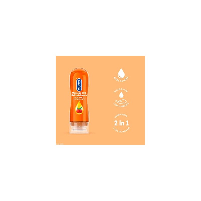 El lubricante Durex Masaje 2 en 1 con afrodisiaco guaraná de 200ml., es un gel muy suave y sedoso aplicable tanto para lubricar como para masajes.
